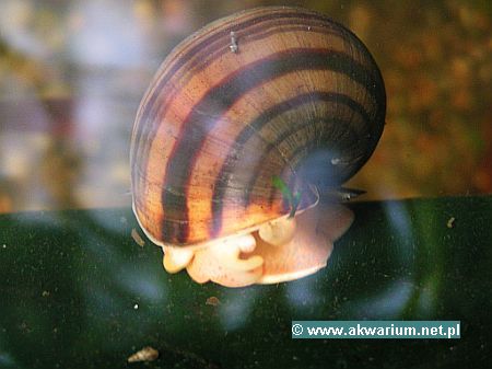 nieco do muszli krajowej żyworódki. Ciało barwy kremowej, niektóre odmiany także stalowoniebieskiej z pomarańczowymi plamkami. Charakterystyczne czułki: jedna para bardzo długich, umiejscowionych tuż za oczami oraz druga para dużo mniejszych, znajdujących się przy otworze gębowym. Otwór ten wyposażony jest w zrogowaciałą tarkę, służącą do zdrapywania glonów. Z lewej strony ciała ślimaki posiadają niewielki wypustek skórny, który w razie potrzeby potrafią przekształcić w długi syfon służący do pobierania powietrza znad powierzchni wody. Ślimaki dobrze czują się w wodzie o temperaturze powyżej 22°C, twardości 8-12°n (w miękkiej wodzie karłowacieją), pH około 7. Zasadniczym ich pokarmem jest pokarm roślinny (glony, sałata), lecz nie gardzą także pokarmem zwierzęcym i mogą wyjadać ikrę. Z tego powodu nie należy ich umieszczać w akwariach tarliskowych.