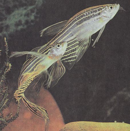 watę, a ściany akwarium zaciemniłem czarną kartką papieru (jeżeli tarło nie nastąpi po dwóch dniach, należy ryby wyłowić, obficie karmić i na przykład za tydzień jeszcze raz spróbować). Po 48 godzinach z ikry zaczął wylęgać się narybek, który przyczepiał się do ścianek akwarium. Wtedy stopniowo zacząłem odsłaniać ściany akwarium. Gdy młode- danio zaczęły już