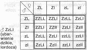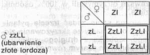 Mamy do dyspozycji samczyka gupika o zabarwieniu złotym, a więc posiadającego (zgodnie z przykładem I) dwa geny “zz". Samczyk ten jest jednak wadliwy, gdyż ma skrzywiony kręgosłup. Wada tego rodzaju, zwana lordozą, jest dziedziczna i wywołuje ją obecność dominującego genu, który oznaczamy dużą literą “L". Osobniki posiadające choć jeden gen “L", a więc kombinacje “LL" i “LI" wykazują skrzywienie kręgosłupa. Tylko osobniki posiadające dwa geny “I", a więc kombinację “II" mają kręgosłup normalny. Rozważmy, czy uda nam się z krzyżówki tego osobnika z dziką samiczką otrzymać osobniki złote bez wady kręgosłupa? Musimy w tym wypadku rozważać działanie dwóch par genów jednocześnie.