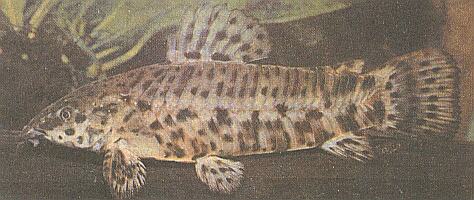 długich wąsów, oko małe. Płetwy zaokrąglone, również z licznymi plamkami. U nasady