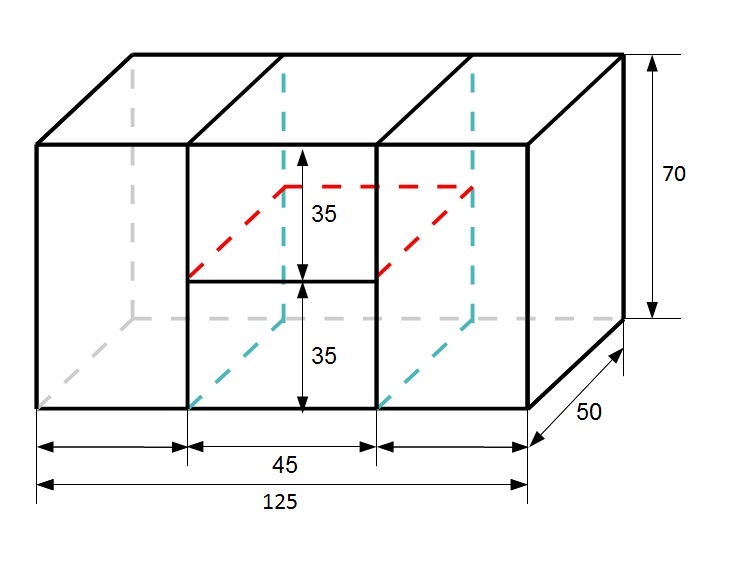 Układ będzie podobny tylko w lewa i prawa część będzie dzieliła się na pół (tak jak jest na środku). A środek na 4 części, wyjdą 4 gołe pułki, nie szuflady. Szafka będzie zbudowana z 18mm płyt laminowanych. Blat i spód podwójnie. Boki, przegrody pionowe i tył tylko z pojedynczej płyty. A teraz pytania: